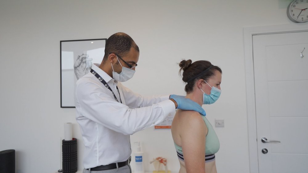 When we look at the back in this rolled shoulder position, the muscles on our backs are lengthened (stretched). They’re holding you up and stopping yourself from going forward. They’re constantly working, and that will produce a lot of tightness onto your muscles and eventually reduce the mobility of the spine. With a range of treatments, including massage, manipulations, and mobilizations, we can get the mobility back into the spine. We also want to make sure that this doesn’t keep happening. So we will take you through a set of exercises, strengthening, and rehab to not only correct your spine, but to stop this from happening again.
